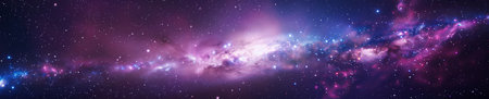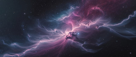Witness a breathtaking nebula formation in this stunning illustration of deep space. A colorful and vibrant tapestry of purple, blue, and pink hues illuminate the night sky, showcasing the cosmos and its celestial wonders. This artwork depicts a galaxy filled with countless stars and cosmic dust, offering an ethereal and mysterious background. Ideal for wallpaper, artistic projects, and science education materials, this cosmic display embodies the beauty of the universe. Explore the depths of outer space and its nebula formations.