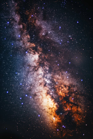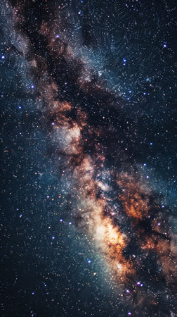 A breathtaking view of the Milky Way galaxy showcases vibrant colors and intricate patterns of stars and cosmic dust against a dark night sky, revealing the beauty of the universe