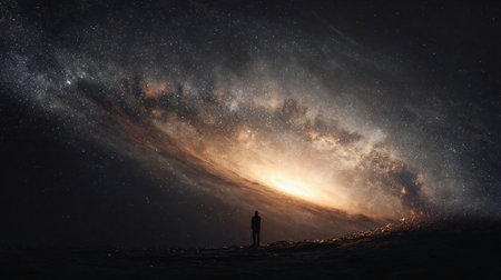 A man stands at the edge of a black hole, gazing into the depths of the universe, surrounded by stars in a mesmerizing cosmic abyss