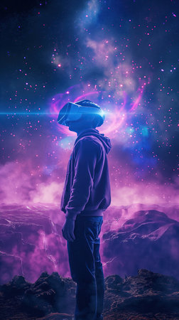 A concept edit of a man standing on the edge of a mountain, looking out across stars in the night sky.