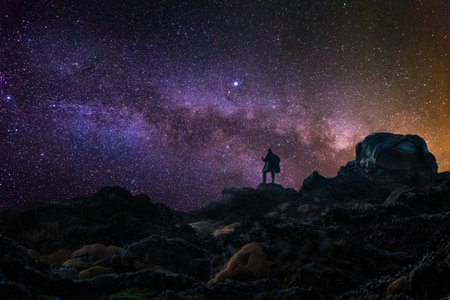 Silhouette of a man standing on a rocky mountain at night and looking at Milky Way. Inspiring view of stars in the sky.