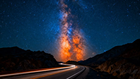 A breathtaking view of the Milky Way galaxy showcases vibrant colors and intricate patterns of stars and cosmic dust against a dark night sky, revealing the beauty of the universe