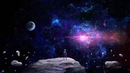 Space background. Sci-fi astronaut standing on rock with colorful fractal nebula and planet . 3D rendering