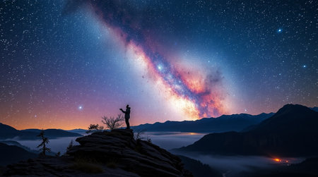 Concept photo of a person gazing up at a starry night sky, with the Milky Way galaxy stretching above them. The vastness of the universe and the persons small presence signify the grandeu