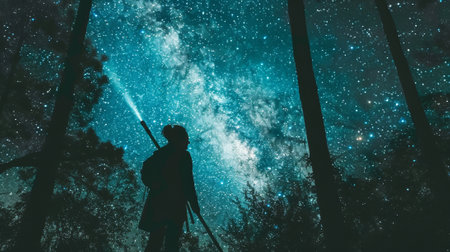 A lone person stands in a serene landscape, using a flashlight to illuminate the dark night sky filled with stars, showcasing the beauty and mystery of our universe.