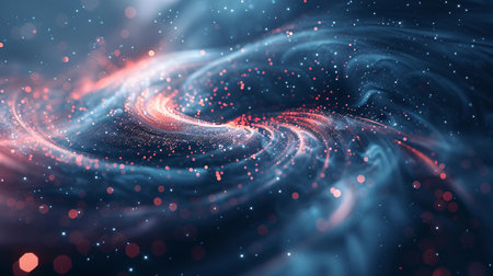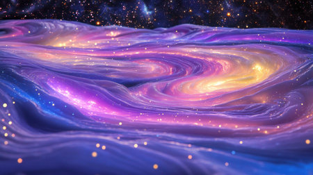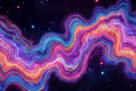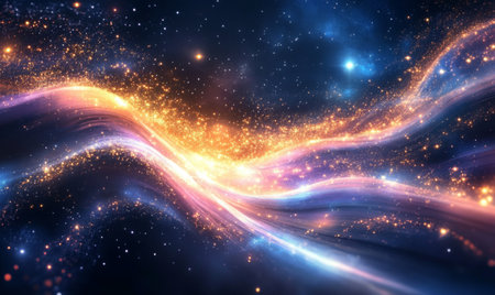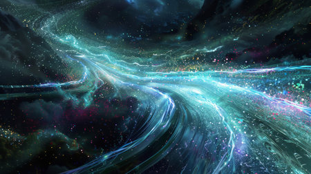 Wavy cosmic matter is swirling in the universe, creating a mesmerizing nebula with glowing particles and vibrant colors