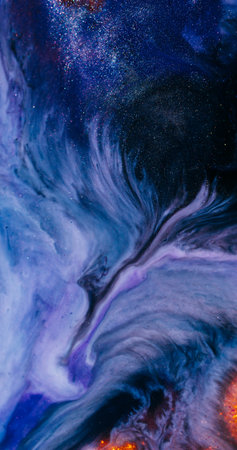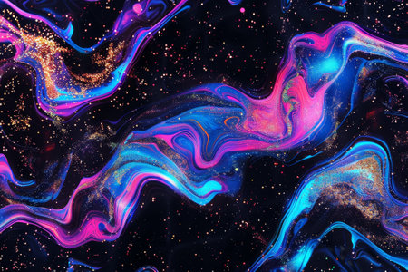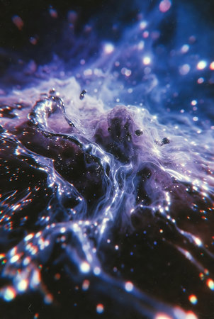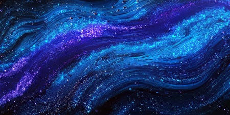 An abstract artwork features flowing waves of purple and blue hues, creating a dynamic visual effect. The composition includes a dark background speckled with tiny white elements resembling stars. This artistic illustration could be suitable for digital backgrounds, design projects, or artistic print applications.