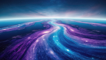 Experience the breathtaking beauty of a celestial river flowing into the ocean, evoking feelings of wonder, peace, and the infinite possibilities of the universe.