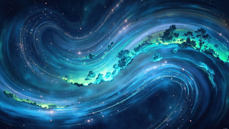 Explore a mesmerizing cosmic landscape featuring swirling waves of vibrant blue and green, illuminated by sparkling stars that create a captivating sense of depth and wonder.