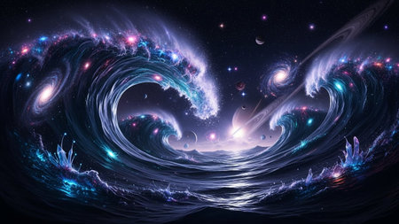 Cosmic ocean waves with swirling galaxies and planets create a dramatic and surreal spectacle in a starry nebula...