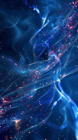 This digital artwork presents flowing lines against a dark backdrop, suggestive of cosmic energy. The composition features cool blues and hints of golden light, evoking a sense of depth and movement. It could be used for various projects, including editorial features or visual designs.