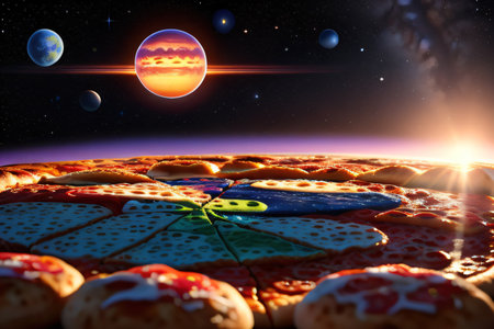 Pizza slice with olives and pepperoni flying through space with planets
