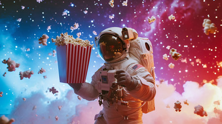 Astronaut in a spacesuit with a box of popcorn in outer space