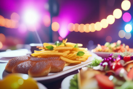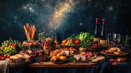 A luxurious buffet table adorned with gourmet food and decor for an evening party, with ample space for text