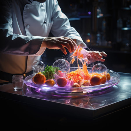 Chef arranging molecular gastronomy dishes, vibrant kitchen backlighting