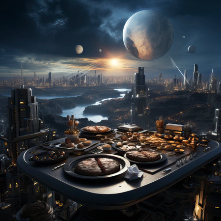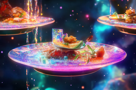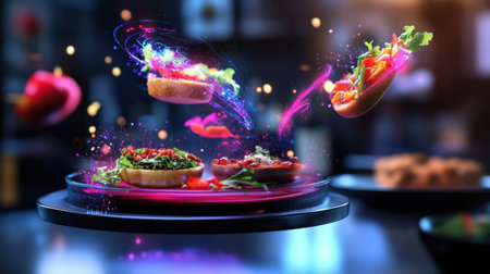 A holographic food delivery app in mid-air, vibrant images of food spinning in 3D above a sleek surface.