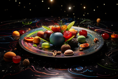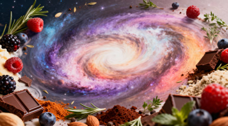 A creative digital illustration depicting High-quality creative of abstract food galaxy, swirling patterns of ingredients, natural lighting, artistic appeal. This AI-generated artwork features unique visual elements suitable for various commercial and editorial applications. AI-generated illustration.
