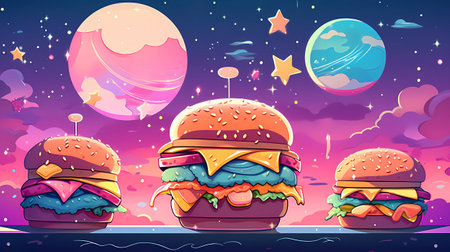 Cartoon fast food hamburgers on the background of the night sky. Vector illustration
