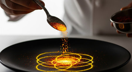 Chef sprinkling glowing spice to create magical food art on a black plate, a creative gourmet concept