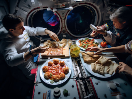 An astronaut enjoys a meal aboard a spacecraft, featuring plastic-wrapped food items like fruits and crackers, while looking through a window at Earth.