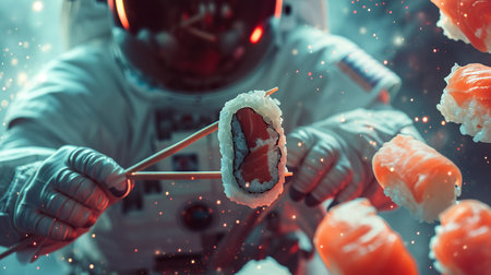 An astronaut eat sushi levitating in open space background