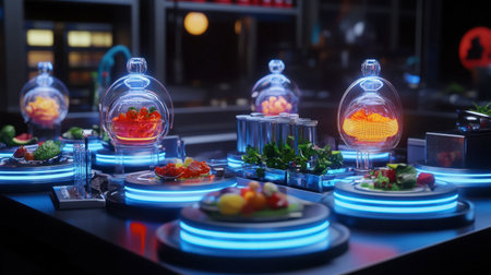 A vibrant futuristic kitchen scene featuring a variety of colorful dishes displayed under glass domes, accentuated by glowing LED lights, showcasing modern culinary art.