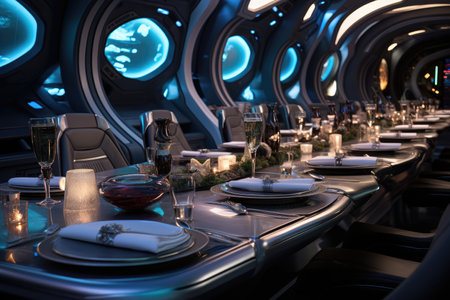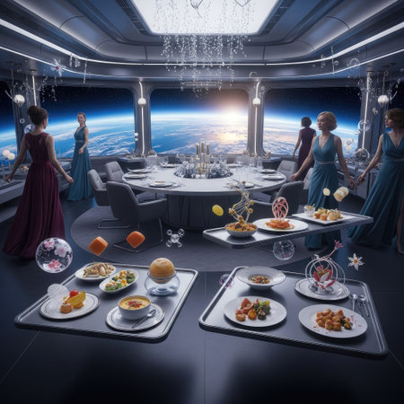 A restaurant with a view of the Earth and the moon. The tables are set with plates, wine glasses, and silverware. The chairs are white and arranged around the tables. The atmosphere is elegant
