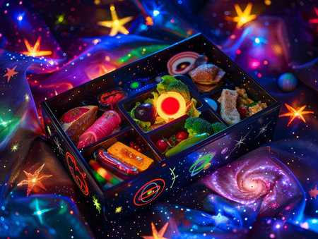 Cosmic lunchbox, alien symbols, intergalactic flavors, meals from different planets Surrounded by stars and nebulae Realistic, Ethereal lighting, Bokeh effect, Wormseye view