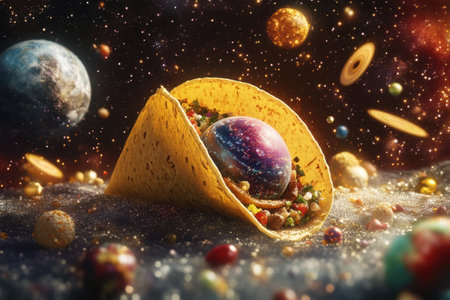 A taco is on a table with a bunch of candy and planets. The taco is surrounded by a lot of candy and planets, giving the image a fun and playful vibe