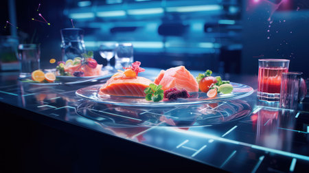 Experience the fusion of culinary art and technology with a beautifully presented grilled salmon dish featuring vibrant vegetables and digital enhancements for a modern dining experience.