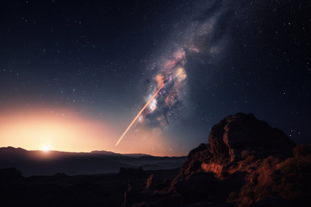 Generative AI : Spectacular view of galaxy in sky with interstellar gas over rough majestic dark rocky mountains of sierra de gredos regional park in spain