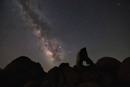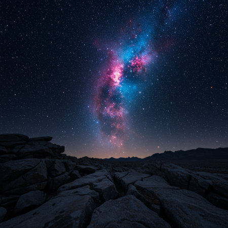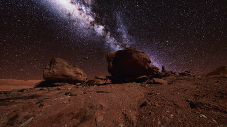 An awe inspiring scene captures the vast desert under the night sky. Boulders loom in the foreground as countless stars twinkle above, revealing the stunning Milky Way's spiral arms.