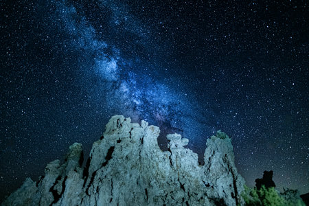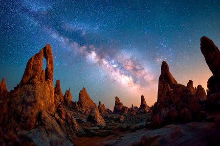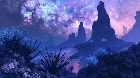 Under a vast starry sky, jagged rocks rise dramatically against a backdrop of the Milky Way, creating a breathtaking landscape that captures the beauty of nature during the night.