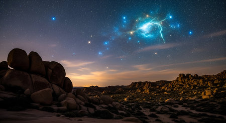 A rugged desert landscape with large rock formations and sparse vegetation under a twilight sky. A vibrant blue and yellow nebula is visible in the starry night sky, creating a surreal and awe-inspiring scene. The warm glow of the setting sun or rising moon is visible on the horizon.