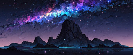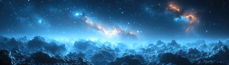 unreal breathtaking natural landscape at night , mountains and starry sky with glowing nebulae