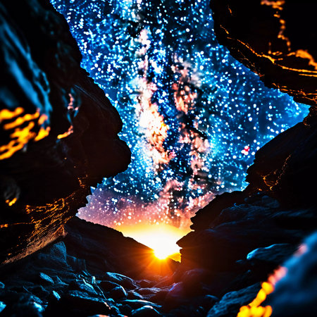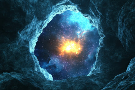 A glowing explosion lights up a rocky cave, revealing a vibrant galaxy filled with stars and cosmic colors.