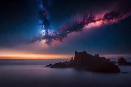 Milky Way and Ocean Long Exposure at Twilight.Epic, serene image of the Milky Way galaxy over a vibrant orange horizon and coastal rocks, with smooth, misty water effect.