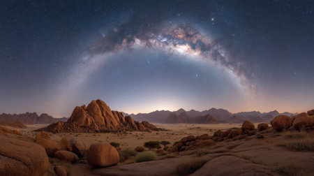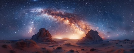 Breathtaking view of a clear night sky filled with stars and a stunning Milky Way arc over a peaceful desert landscape, showcasing natural beauty and cosmic wonder.