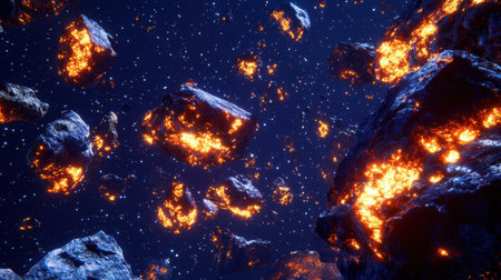 View of a dense asteroid field composed of chunky, highly reflective, dark metallic objects with deep craters emitting internal amber light against a starry zero-gravity environment.