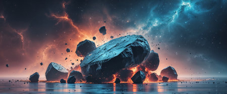 Cosmic Meteor Field with Asteroids and Nebulae in Deep Space