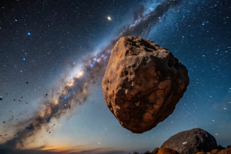 A captivating cosmic scene showcasing asteroids scattered across a dark surface, surrounded by a breathtaking starry sky filled with distant galaxies.