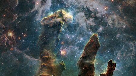 Breathtaking view of swirling cosmic clouds and celestial bodies in deep space. Stars and nebulae are depicted in vibrant colors against a dark background.