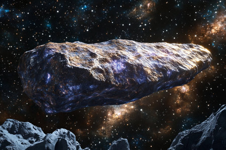 Countless asteroids floating in the vast expanse of deep space near a vibrant galaxy create a stunning cosmic scene, filled with mystery and the allure of the unknown
