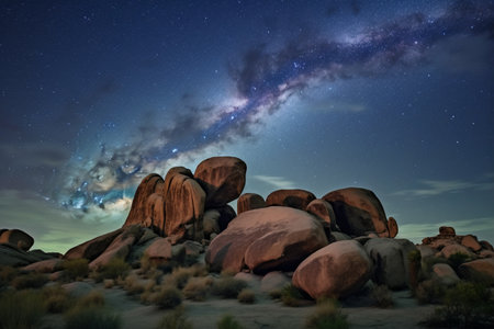 An AI generated illustration of Boulders near Joshua Tree national park at night with the milky way