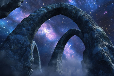 Stone arches rise dramatically towards a vibrant starry sky filled with colorful galaxies and clouds.