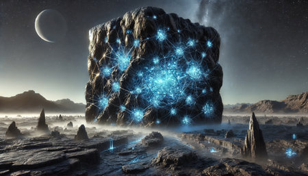 Fluorescent Mystic Rock in a Fantastical Landscape. Image generated using generative AI technology