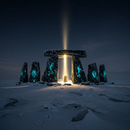 An ancient stone circle under a cosmic sky, with stars twinkling and the Milky Way arching overhead.
