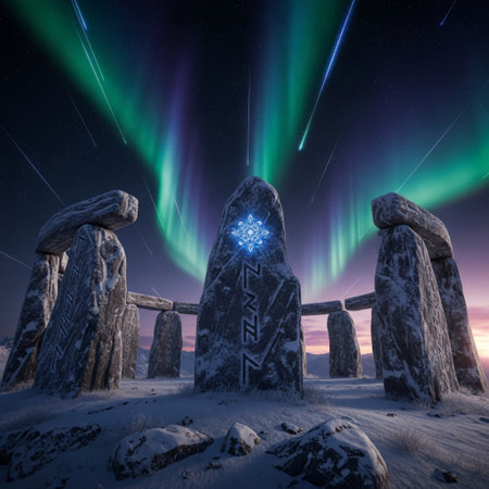 Close-up of ancient rune stones casting shadows under soft lighting