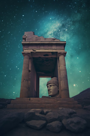 Captivating ancient ruins illuminated by soft twilight, set against a breathtaking starry sky. The tranquil water reflects the stunning milky way, creating an enchanting landscape ideal for exploration and serene moments.