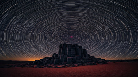 Captivating view of a stupa surrounded by swirling star trails in a vibrant night sky, highlighting the serene beauty of nature and culture in the mountains.